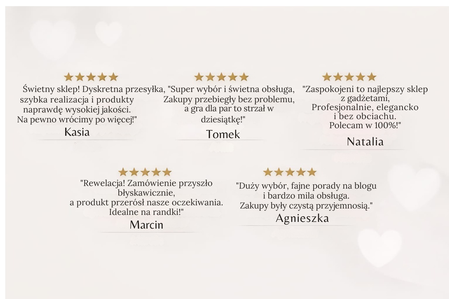 Zaspokojeni powstało z myślą o parach, które chcą być bliżej siebie — bez presji, pośpiechu i ocen. Wierzymy, że bliskość to coś więcej niż produkt. To rozmowa, uważność i wspólny czas. Tworzymy przestrzeń, w której komfort intymny i przyjemność idą w parze z poczuciem bezpieczeństwa i dyskrecji. Dlatego starannie wybieramy produkty, które wspierają relację — subtelnie, naturalnie i na Waszych zasadach. Nie chodzi o spełnianie oczekiwań. Chodzi o bycie razem.