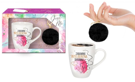 JUST ME - zestaw kubek baryłka 300 ml z napisem ""Zabawna, Inteligentna, Skromna""+ czarny pompon